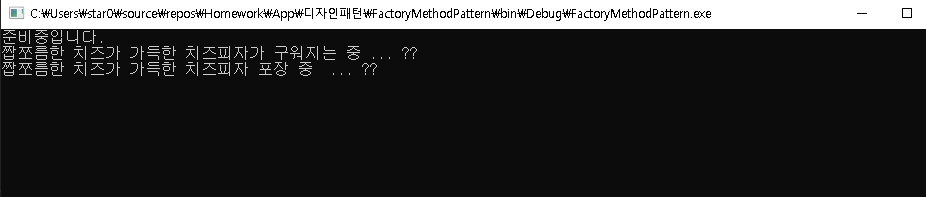 Console.WriteLine("짭쪼름한 치즈가 가득한 치즈피자 포장 중 ... 🍕");
