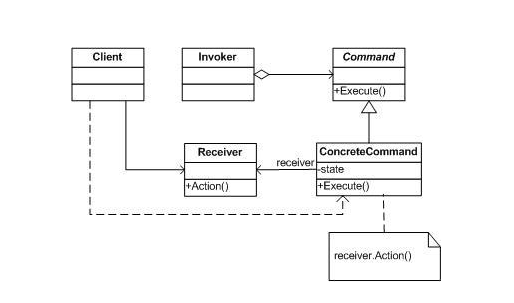 ▷ ConcreteCommand : Receiver object 와 action간의 바인딩을 정의한다. Receiver에서 대응하는 동작을 Invoking에서 실행시키는 것을 구현