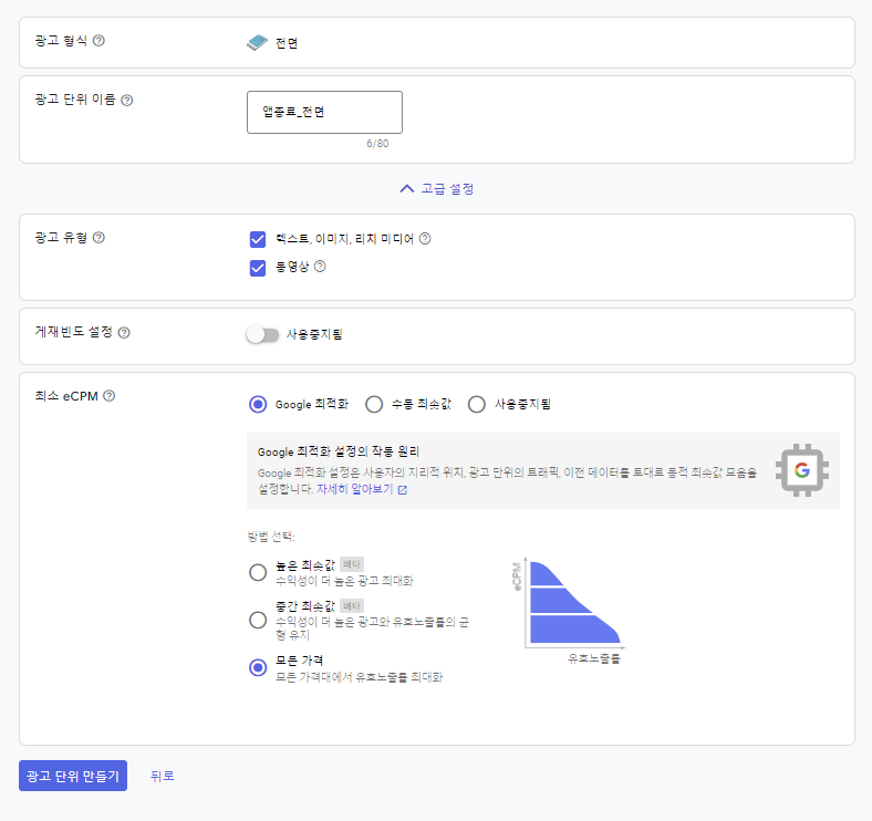 맨위에 광고 단위 추가 버튼을 통해 사용할 광고를 추가할 수 있다.