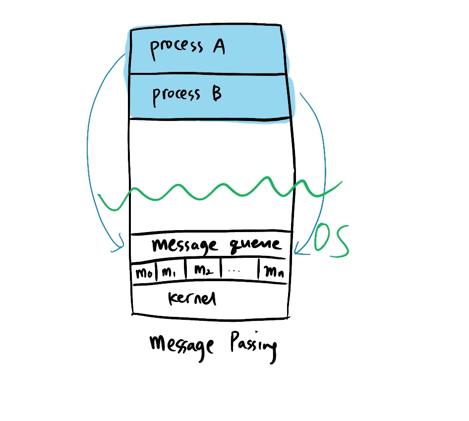 OS에서 관리되는 message queue를 이용하여 프로세스간에 데이터를 공유하는 방식이다. 데이터를 수송신 할 때마다 OS에 접근해야하기 때문에 system call이 빈번하게 일어난다.