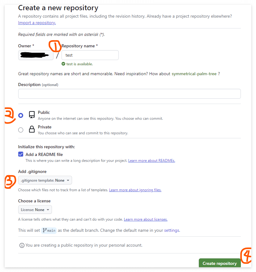 ② 해당 repository를 공개로 올릴 것인지 비공개로 올릴것인지 선택한다.